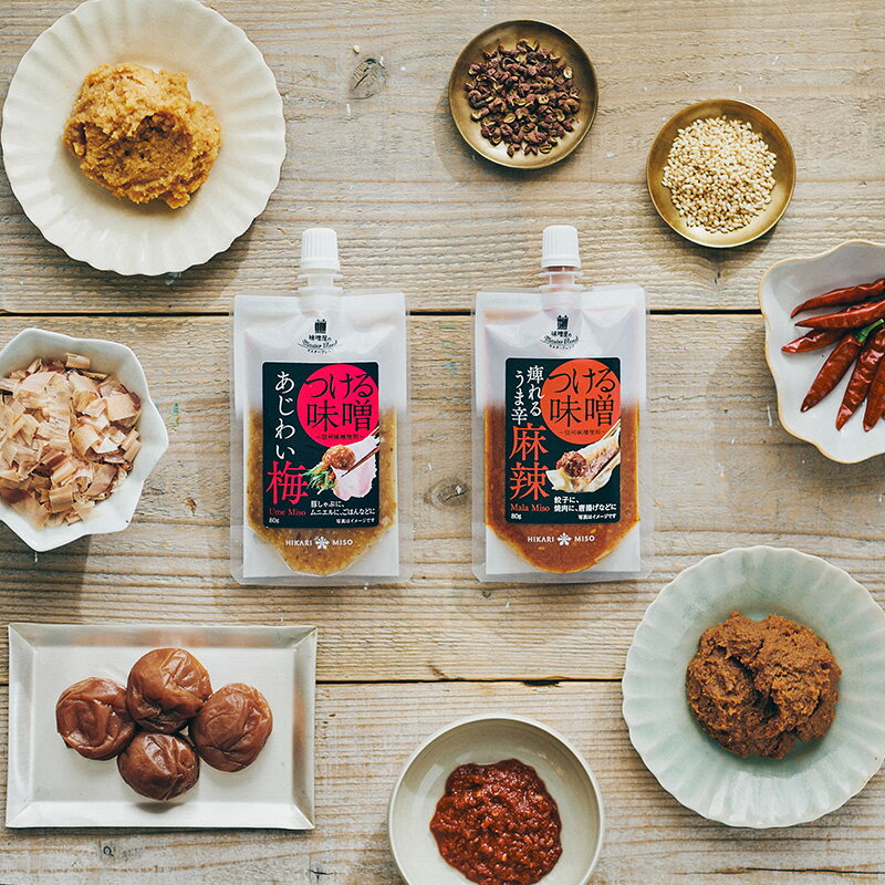 ひかり味噌 味噌屋のマスターブレンドつける味噌 麻辣 80g+梅80g(各1袋)味噌 みそ 調味料 万能調味料 化学調味料不使用 うま辛 焼肉 餃子 唐揚げ 梅 うめ 豚しゃぶ ムニエル ごはんのお供