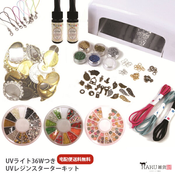 \HARU雑貨 UVレジンセット/ UVライト36Wつき レジン液セット 宅配便送料無料 HARU雑貨のUVレジンスターターキットは、初心者でも始めやすい大容量セット! 当店自慢の、オリジナルUVレジン液がなんと2本も!更にUVライト36Wも1台ついてこの価格! アクセサリー作りが初めての方でも安心の定番基礎パーツ、人気のミール皿やラインストーン、チャームもついて更にデザインの幅が広がりました! キットを使って、作りました! 素材を自由に組み合わせて様々な作品を作ることが可能です! グリッターやデコパーツなどパワーアップ★
